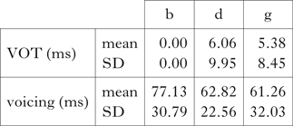 Table III Mean acoustic values of prevoiced lenis stops in word-initial context for group A speakers (contrast).
