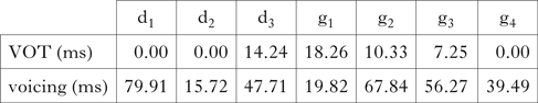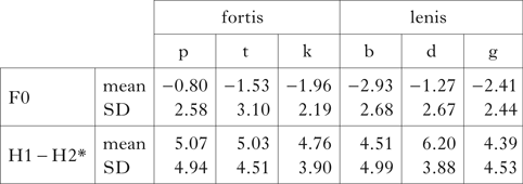 As already observed in Figs 1c and d, the mean values of F0 and H1–H2* do not show any clear pattern with respect to a distinction in the behaviour of the two sets of stops, as shown in Table V.Footnote 12