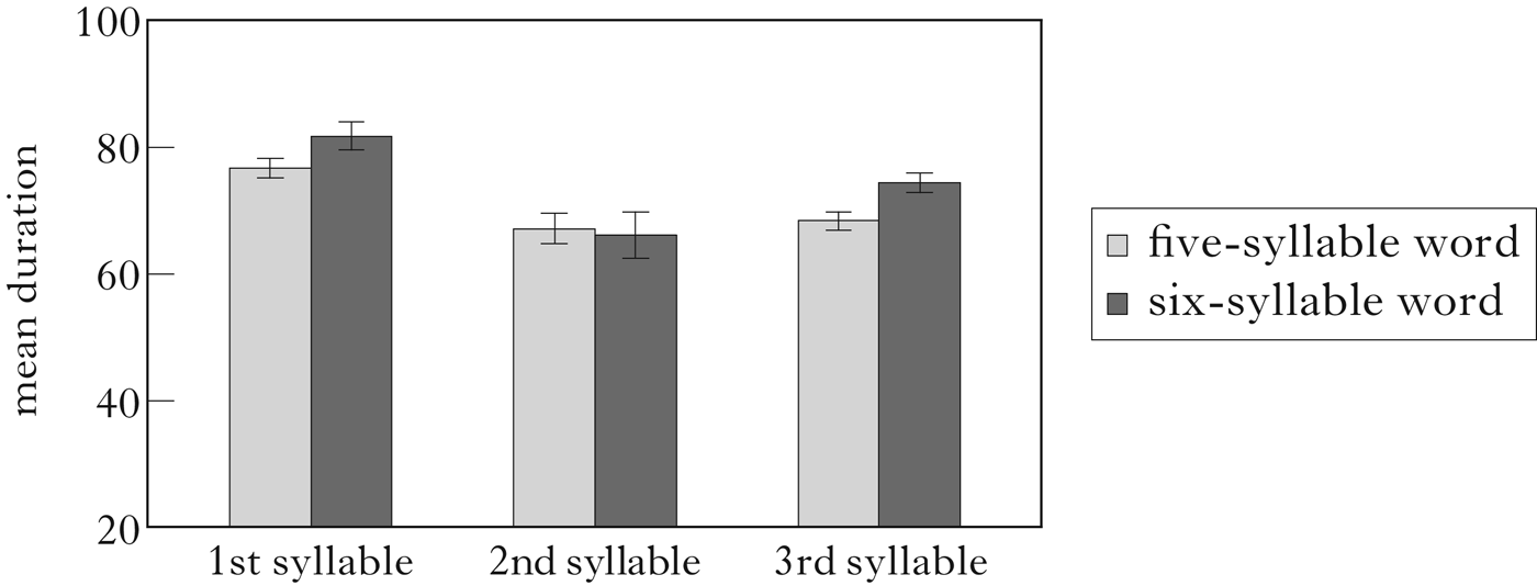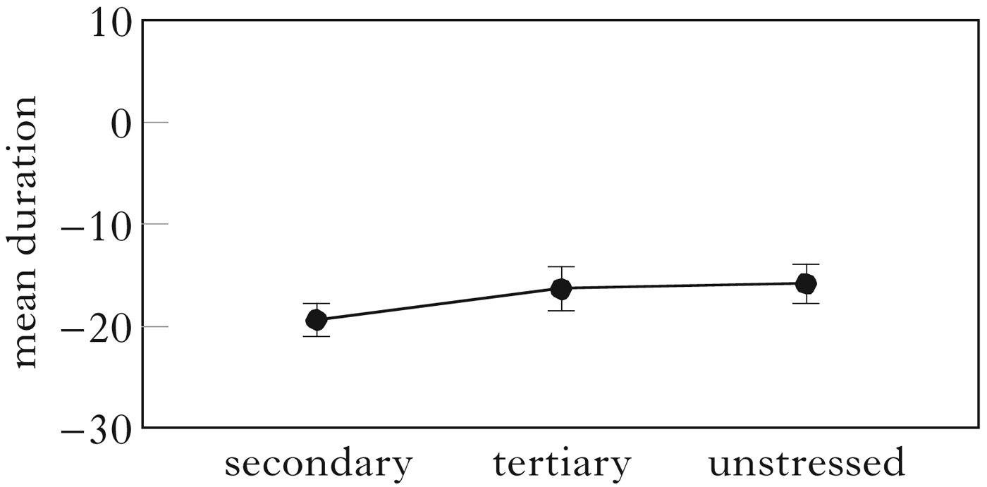 Intuitively, given the regular rhythmic structure of six-syllable words, it would not be at all surprising if the beat perceived on the third syllable were purely epiphenomenal, an image of a trochee built from the properties of the context rather than a real object itself (cf. Hawkins Reference Hawkins2010 on illusory ‘auditory objects’). But it is also possible that word-internal subsidiary prominence is a real effect, but too subtle to emerge in calculations based on the across-token baseline to which estimates for the means corresponding to particular positions are compared. Above all, comparisons based on raw duration values carry a risk of the prominence of the third syllable in six-syllable words being masked by the polysyllabic shortening effect.