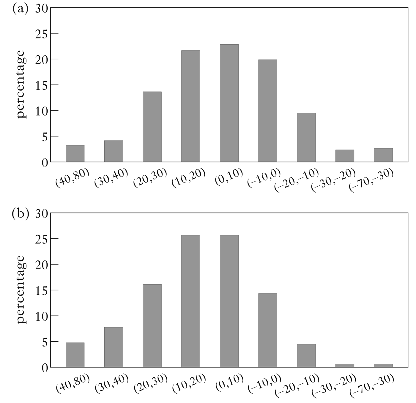 Figure 9 Frequencies of the difference in duration (in ms) between the tertiary stress condition and the unstressed condition for (a) PVI dur (C2·C3) and (b) PVI dur (V2·C3).