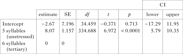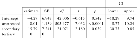 The lme model for PVI d u t (V2.C3) indicated a highly significant effect of stress (χ 2(1) = 163.221, p<0.0001). The PVI difference between five-syllable words (the unstressed condition) and six-syllable words (the tertiary stress condition) amounted to 18.39; see Table I. (The reference category in Table I is the six-syllable word, i.e. the tertiary stress condition.)