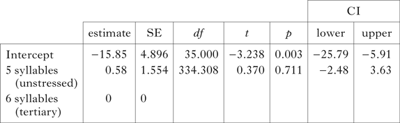 The fourth lme model in the first series was built to test the relationship between tertiary stress and vowel duration. The PVI decrease in six-syllable words by 0.58 was only minimal, and did not reach significance (χ 2(1) = 0.137, p=0.711); see also Table IV and Fig. 5 (as well as Table IX in Appendix C).