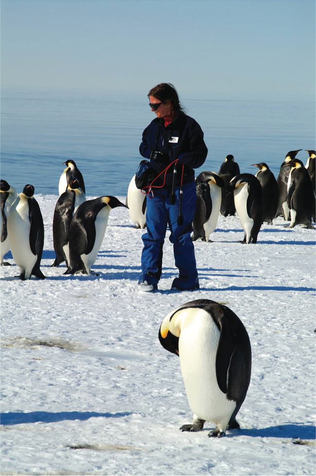 Fig. 1. Veronika Meduna recording emperors at the edge of the summer sea ice. The image was taken by Rob McPhail during a visit in 2001.