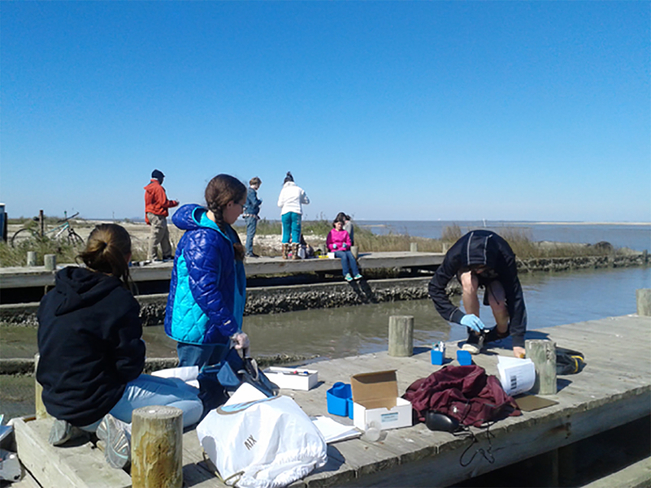 Fig. 4. SMORE students in Texas conduct onsite water tests at Smith Point estuary. (Photo by Lollie Garay.)