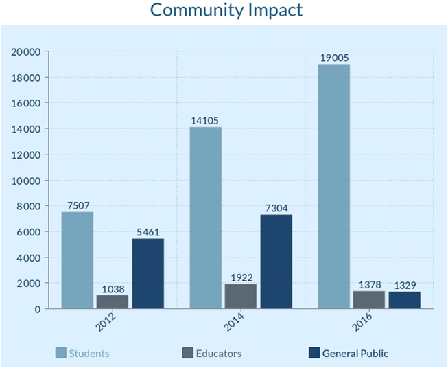 Fig. 5. Graph showing the impact of community outreach during each expedition by Alex Eilers for three targeted groups: students, educators, and general public. (Image courtesy of the Pink Palace Education Department.)