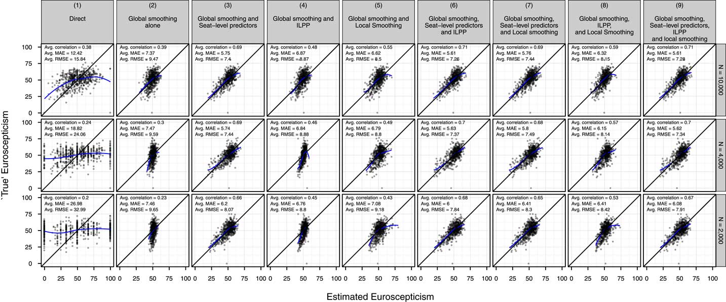 MAEs are higher and correlations are lower in this cross-validation study than in the external validation study. But, even for the largest estimation sample of 10,000, the use of extra information sources to estimate constituency opinion still increases effective sample size by a factor of 2.5: using direct estimation one would need an average constituency sample size of 39 (corresponding to a national sample size of around 25,000) to achieve the average RMSE of the best-performing constituency Euroscepticism estimates we generate based on average constituency sample sizes of 16. With the smallest sample size, correlation, MAE, and RMSE are all nearly as good, and so the effective increase in sample size is nearly ten times as large. With average correlations of around 0.7 and MAEs around 5.5 percent—which corresponds to just over half a SD of “true” constituency Euroscepticism—the estimates for all of the sample sizes are similarly usable.