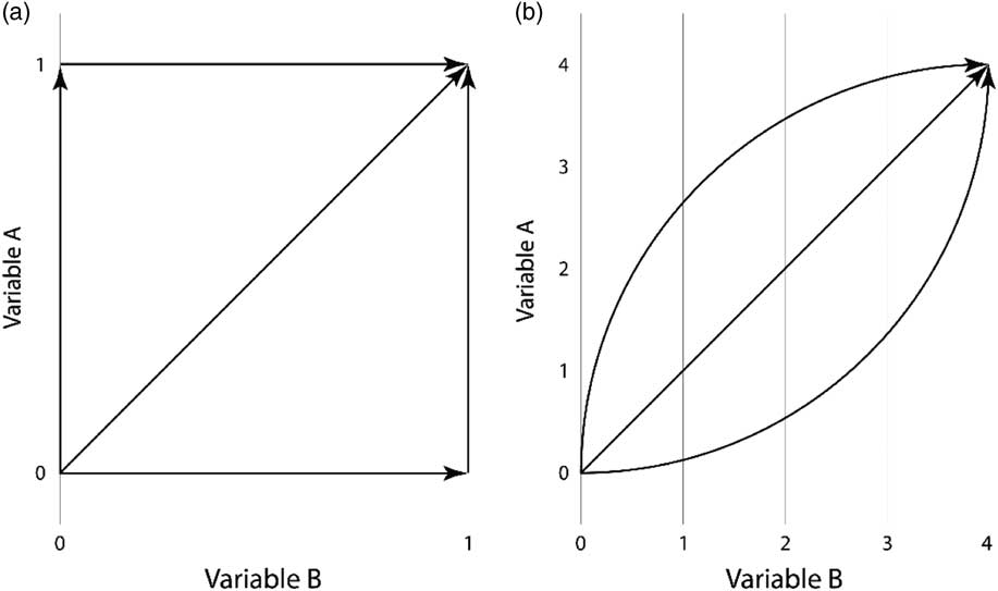 Fig. 1 Potential pathways of change in (a) two binary variables and (b) two comparable ordinal five state variables