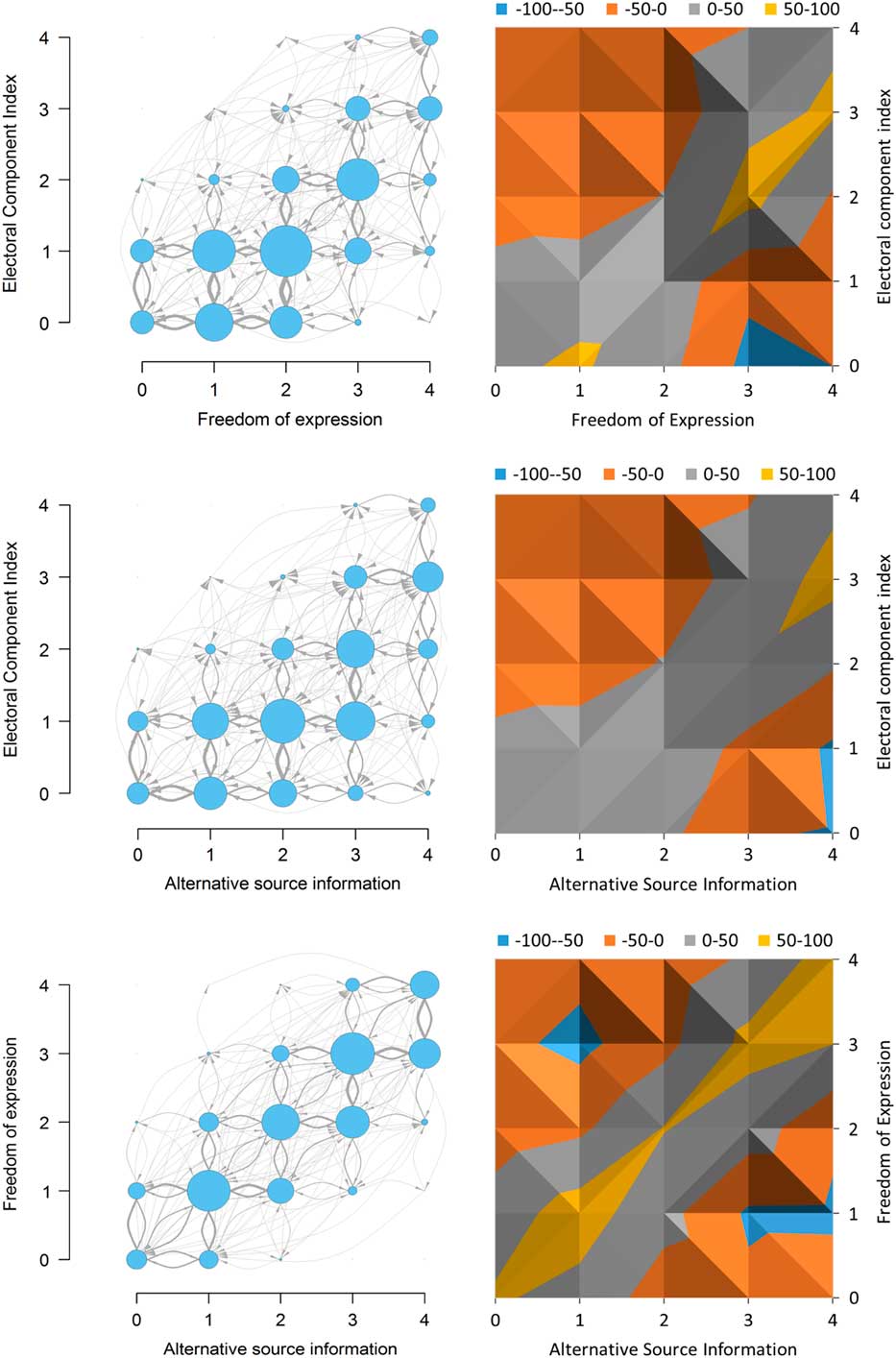 The graph for Freedom of expression and Alternative source information (the lower panel) largely confirms our assumptions and observations from the frequency tables: transitions mostly take place in small steps, and the variables change together or mostly in turn.