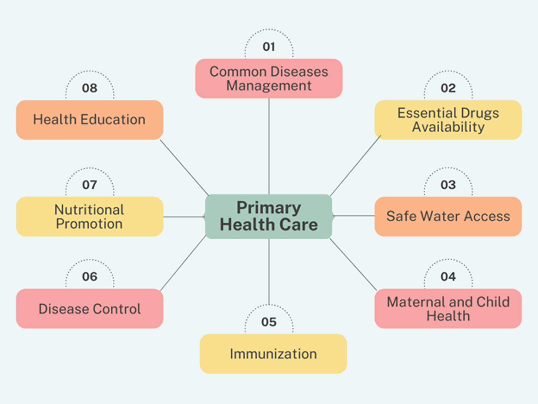 The fundamental concept of primary healthcare (PHC) was first recognized as the cornerstone of “health for all policy” in 1978 at the Alma-Ata convention (Behzadifar, Taheri Mirghaed, and Aryankhesal Reference Behzadifar, Taheri Mirghaed and Aryankhesal2017). It employs a holistic approach that emphasizes overall physical, mental, and social well-being rather than treating certain diseases and organ systems separately. According to the World Health Organization (WHO), PHC focuses on people’s needs, from primary prevention to early detection of disease and intervention, along with rehabilitative services and palliative care (Primary Health Care, 2023). It includes treatment for common illnesses and injuries, access to necessary medications, and a variety of services, such as immunization, family planning, nutrition, prenatal care, prevention, education, and the management of local epidemic outbreaks. The Alma-Ata Declaration specifically listed eight substantial components of PHC, as shown in Figure 1. The sustainable development goals (SDGs) for 2030, from goal two to goal four, include all these fundamental objectives (Behzadifar, Taheri Mirghaed, and Aryankhesal Reference Behzadifar, Taheri Mirghaed and Aryankhesal2017).