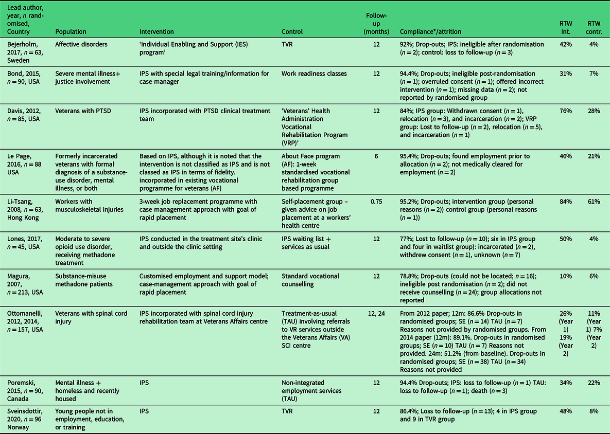 The 10 included trials (913 participants) used supported employment interventions across different populations (Table 1) (Bejerholm et al., Reference Bejerholm, Larsson and Johanson2017; Bond et al., Reference Bond, Kim, Becker, Swanson, Drake, Krzos, Fraser, OʼNeill and Frounfelker2015; Davis et al., Reference Davis, Leon, Toscano, Drebing, Ward, Parker, Kashner and Drake2012; LePage et al., Reference LePage, Lewis, Crawford, Parish, Ottomanelli, Washington and Cipher2016; Li-Tsang et al., Reference Li-Tsang, Li, Lam, Hui and Chan2008; Magura et al., Reference Magura, Blankertz, Madison, Friedman and Gomez2007; Ottomanelli et al., Reference Ottomanelli, Goetz, Suris, McGeough, Sinnott, Toscano, Barnett, Cipher, Lind, Dixon and Holmes2012; Poremski et al., Reference Poremski, Rabouin and Latimer2015; Lones et al., Reference Lones, Bond, McGovern, Carr, Leckron-Myers, Hartnett and Becker2017; Sveinsdottir et al., Reference Sveinsdottir, Lie, Bond, Eriksen, Tveito, Grasdal and Reme2020). Each compared to some form of TVR/services as usual, as per inclusion criteria. One paper reporting follow-up data for one of the included trials and two available protocols for included trials were also included in our review material (Ottomanelli et al., Reference Ottomanelli, Barnett and Goetz2014; Ottomanelli et al., Reference Ottomanelli, Goetz, McGeough, Suris, Sippel, Sinnott, Wagner and Cipher2009; Sveinsdottir et al., Reference Sveinsdottir, Tveito, Bond, Grasdal, Lie and Reme2016).