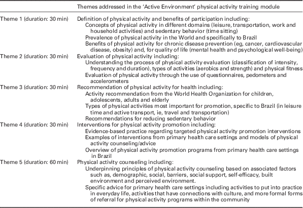 As noted above, the physical activity component was called ‘Active Environment.’ It was based on both previous studies on physical activity promotion interventions in primary health care conducted in the eastern region of São Paulo city (Florindo and Andrade, Reference Florindo and Andrade2015) (www.each.usp.br/ambienteativo) and from the physical activity promotion content devised by the ‘Healthy Europe Through Learning and Practice’ project (http://www.help-project.com/).
