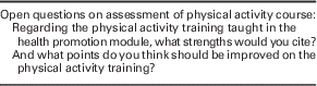 To assess the opinion of health professionals about physical activity training we used two questions and to verify professional conduct for physical activity counseling we used one question (Table 2).