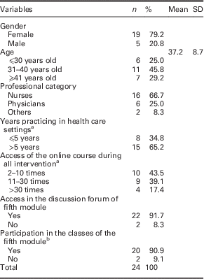 Table 3 Characteristics of health professionals that accessed the fifth module of course (major health risk factors) and answered the questions about physical activity training (n=24)