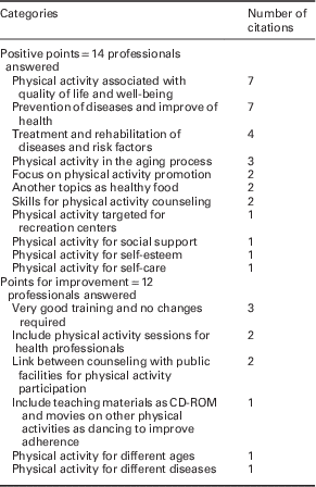 The focus on physical activity promotion and the skills required to advise patients were however, less cited. In this case we need to improve these themes, because the main objective of the training is to develop the empowerment the health professionals for physical activity counseling, according to other interventions such as ‘PACE’ (Long et al., Reference Long, Calfas, Wooten, Sallis, Patrick, Goldstein, Marcus, Schwenk, Chenoweth, Carter, Torres, Palinkas and Heath1996; Ainsworth and Youmans, Reference Ainsworth and Youmans2002) and ‘Green Prescription’ (Elley et al., Reference Elley, Kerse, Arroll and Robinson2003; Hamlin et al., Reference Hamlin, Yule, Elliot, Stoner and Kathiravel2016). For this it is important to include practical counseling activities and examples of patients in primary health care settings during the three weeks of this training, as it is done in ‘Exercise is Medicine’ intervention (Calle et al., Reference Calle, Lobelo, Jiménez, Páez, Cortés, Lima and Duperly2016).