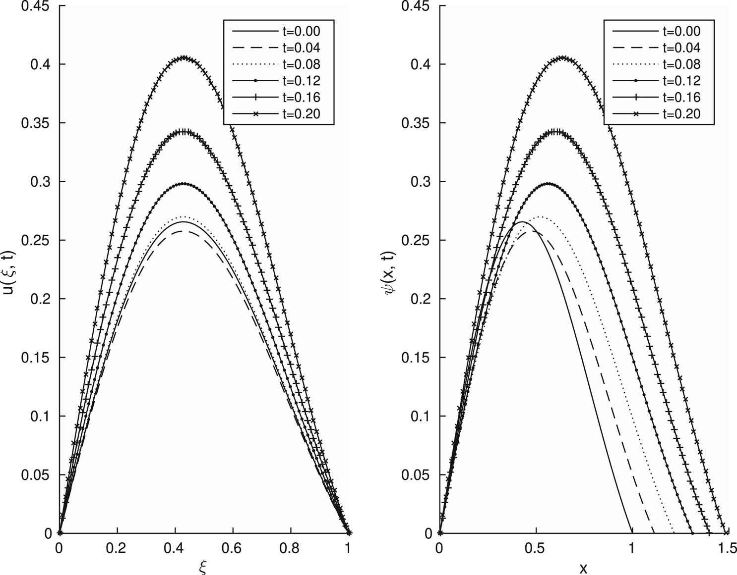 We begin by transforming onto a fixed spatial domain. We change variables from $\psi (x,t)$ to $u(\xi,t)$