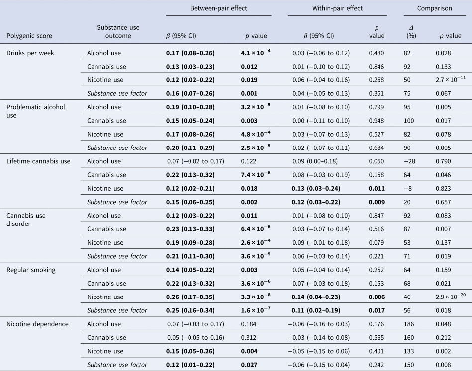 Our finding that within-pair associations between PGSs and substance use outcomes were generally small, nonsignificant, and significantly smaller than the corresponding between-pair associations highlights the influence of demographic and family environmental factors on substance use in adolescence and young adulthood. Between-family PGS prediction of substance use may thus be substantially driven by these effects. These results are compatible with research suggesting that PGS prediction of other complex psychological phenotypes (e.g. IQ and educational attainment) is also substantially driven by these indirect processes (Selzam et al., Reference Selzam, Ritchie, Pingault, Reynolds, O'Reilly and Plomin2019). However, significant within-pair associations between two PGSs (i.e. the Lifetime Cannabis Use-PGS and Regular Smoking-PGS) and nicotine use indicate that the corresponding between-pair associations cannot be fully explained by these processes, suggesting a direct genetic effect that may be unique to these measures.