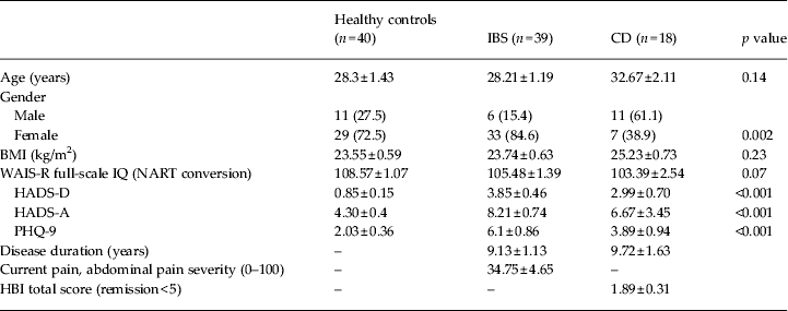 IBS, Irritable bowel syndrome; CD, Crohn's disease; BMI, body mass index; WAIS-R, Wechsler Adult Intelligence Scale – Revised; NART, National Adult Reading Test; HADS-A/D, Hospital Anxiety and Depression Scale – Anxiety/ Depression; PHQ-9, nine-item Patient Health Questionnaire; HBI, Harvey Bradshaw Index.