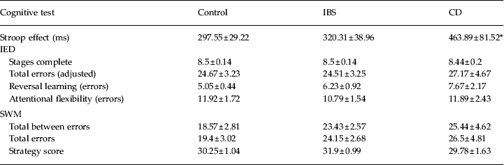 In this study we tested the hypothesis that IBS is associated with cognitive impairment. We used CANTAB, a highly standardized and well-validated cognitive test battery (Strauss et al. Reference Strauss, Sherman and Spreen2006), to assess performance in IBS and CD in comparison with healthy controls across several cognitive domains including reversal learning and attentional flexibility (IED), selective attention and response inhibition (Stroop), working memory (SWM) and visuospatial episodic memory (PAL). To our knowledge, this is the first time that such a detailed cognitive assessment has been performed in either condition.