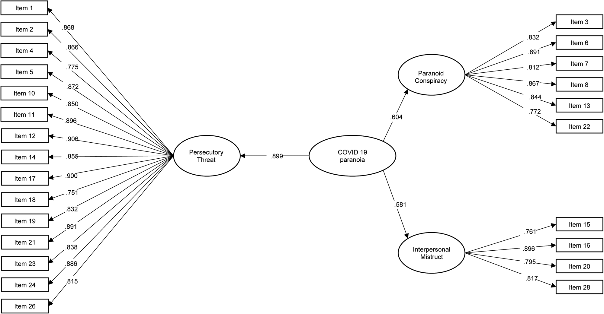 To test whether the three PPS factors can be combined into one global indicator of pandemic paranoia, we repeated the CFA with an additional second-order factor. As can be seen in Fig. 2, all three factors showed large loadings on the second-order factor (Persecutory Threat: 0.899, Paranoid Conspiracy: 0.604 and Interpersonal Mistrust: 0.581).