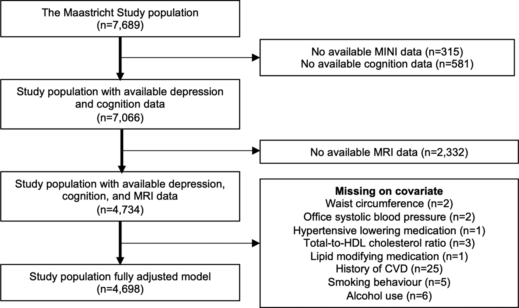 We used cross-sectional data from the Maastricht study, an observational population-based cohort study. The rationale and methodology have been described previously (Schram et al., Reference Schram, Sep, van der Kallen, Dagnelie, Koster, Schaper and Stehouwer2014). In brief, the study focuses on the etiology, pathophysiology, complications, and comorbidities of T2DM, heart disease, and other chronic conditions, and is characterized by an extensive phenotyping approach. Eligible for participation were all individuals aged between 40 and 75 years and living in the southern part of the Netherlands. Participants were recruited through mass media campaigns, the municipal registries, and the regional Diabetes Patient Registry via mailings. Recruitment was stratified according to known T2DM status, with an oversampling of individuals with T2DM, for reasons of efficiency. Fig. 1 shows the flowchart of the study population. Baseline surveys were completed between November 2010 and January 2018. From the initial 7689 participants, depression and cognitive functioning data was available in n = 7066 participants. Magnetic resonance imaging (MRI) measurements were implemented from December 2013 onwards until February 2017 and were available in 4734 participants. We performed complete case analyses in which 4734 participants were included in the key analyses and 4698 participants in the fully adjusted analyses. All participants gave written informed consent.