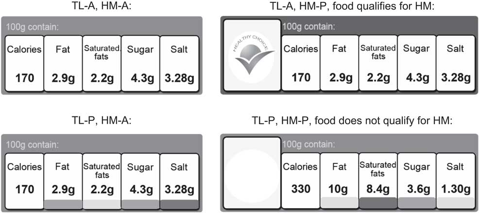 Fig. 1 Examples of the front-of-package nutrition information stimuli (according to the experimental manipulations): TL-A = traffic light colour-coding absent; TL-P = traffic light colour-coding present; HM-A = health mark absent; HM-P = health mark present. Fictitious values are provided in Fig. 1; in the study, the value corresponded to the actual nutrient content of the foods