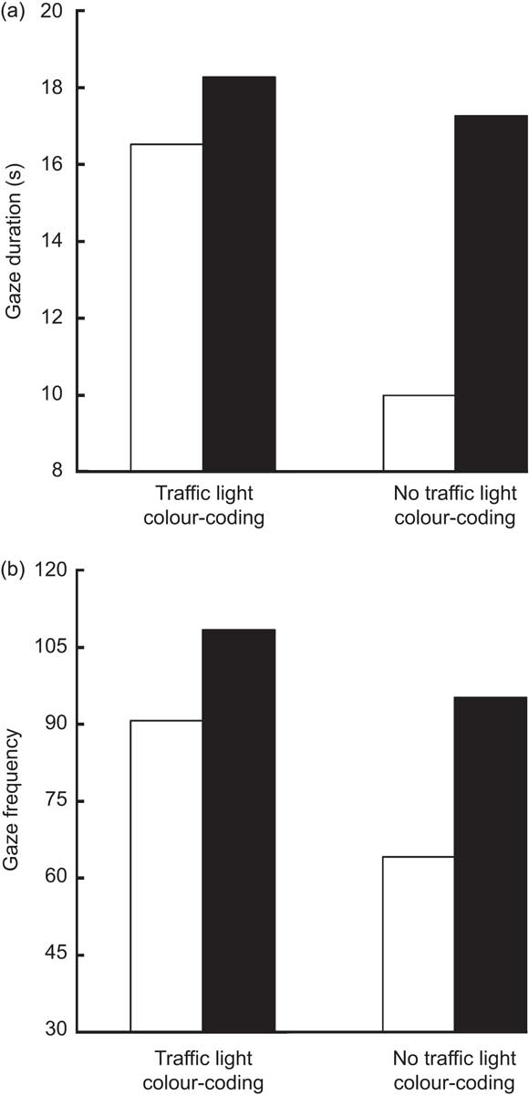 Fig. 2 Gaze duration (a) and gaze frequency (b) on the product packaging of the snack foods as a function of numeric front-of-package nutrition information with (v. without) health marks and with (v. without) traffic light colour-coding among 160 consumers aged 19–64 years who were mainly responsible for grocery shopping in their household (