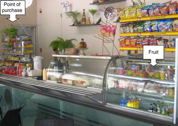 To avoid major variations in the flux of customers across phases, the daily hours in which fruit was sold in the cafeteria were strictly controlled. Coordination with the cafeteria manager and staff during all phases of the experiment focused on the following issues: (i) not revealing to customers that fruit consumption was being recorded for a study; (ii) complying with the hours of fruit sales; (iii) the location of the fruit; (iv) logistical issues including fruit purchase, quality assurance and freshness; (v) recording of data; and (vi) weekly data transfer to the research team. Fruit provided to the cafeteria was of optimal appearance and quality.
