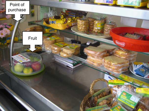 Our study explored not only the price effect, but the effect of providing a health message with better visibility of fruit near the point of purchase as well. Interventions using point-of-purchase promotion have demonstrated success as marketing strategy( Reference Buscher, Martin and Crocker 14 , Reference Glanz and Hoelscher 17 ). In contrast, the use of health messages shows inconclusive results in terms of effectiveness( Reference Horgen and Brownell 28 , Reference Anderson, Bybee and Brown 30 , Reference Epstein, Jankowiak and Nederkoorn 31 ). In the unsuccessful interventions with university students, one potential explanation is that nutrition labelling is less eye-catching and does not advertise as well the taste, cost, convenience and energy value of fruit compared with unhealthy options( Reference Buscher, Martin and Crocker 14 , Reference Horgen and Brownell 28 ).