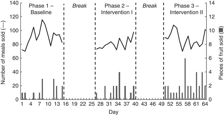 The primary outcome variables in the study were: (i) daily pieces of whole fruit purchased; (ii) daily number of full meals sold, hereafter referred to as ‘meals’, a proxy measure of the daily number of cafeteria users; and (iii) the fruit ratio, defined as the ratio between the total pieces of fruit purchased and the total number of meals sold in the same day. There were 14–15 d of observation for each phase.