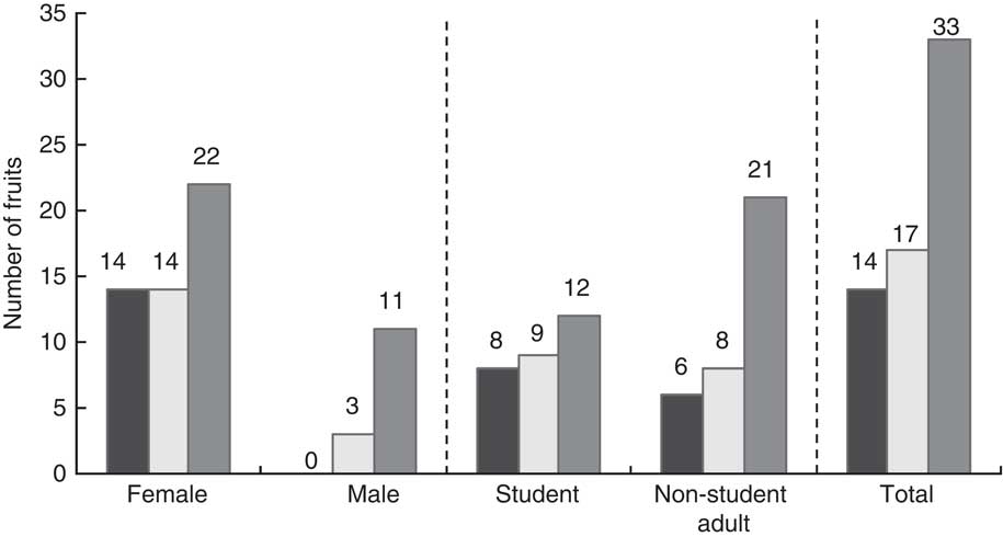 Non-student adults increased their fruit purchasing when exposed to each of the different experimental phases (P<0·05 for Phase 1 to 2, for Phase 2 to 3 and for Phase 1 to 3), but this increase was not observed among students. Between Phases 1 and 3, non-student adult females doubled their fruit purchasing, while non-student adult men tripled their purchasing. However, male students were the group with the lowest fruit consumption: only two male students purchased fruit during the study, both in Phase 3. Female students maintained a constant level of purchasing throughout the study (eight, nine and ten pieces of fruit in Phases 1, 2 and 3, respectively).
