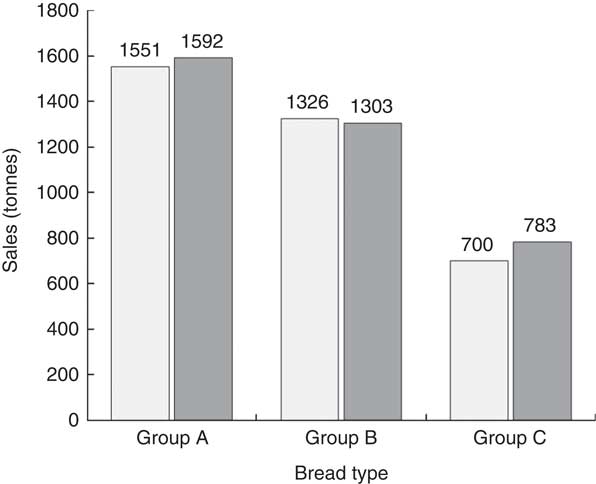 Figure 1 shows comparative sales data between 2012 (standard breads) and 2013 (the same breads with NaCl partially replaced) for the different groups. The yearly total represents sales of 3577 tonnes in 2012 and 3678 tonnes in 2013 (+2·8 %), so the two years were virtually identical in this respect, both as a whole and within each group. These figures are consistent with the sales for other breads (i.e. the 2013 sales were similar to those of 2012). Moreover, throughout 2013, no formal complaints were received as a direct or indirect consequence of the reduction in salt.