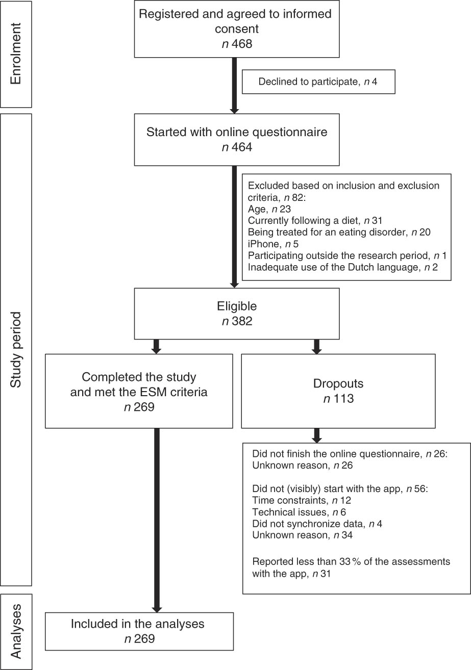 Individuals had to be 20–50 years of age to be included in the analyses, as research has shown the largest increase in overweight individuals in recent years within this age group in the Netherlands( 53 , 54 ). Participants had to be in possession of an Android smartphone as the Snackimpuls app was available only for this platform. Exclusion criteria were currently following a diet, being treated for an eating disorder in the present or the past, participating outside the research period (see ‘Procedure’ below) and unfamiliarity with the Dutch language. There were no criteria regarding BMI. Based on these criteria, 382 of the 468 participants were eligible to participate in the present study (Fig. 1).