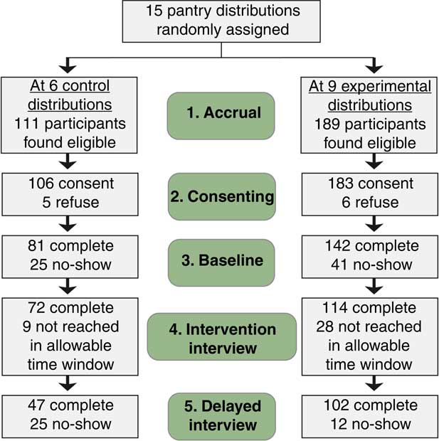 1. Accrual. Potential participants were approached in pantry lines during a regular food distribution to determine eligibility. Attempts to enrol participants continued throughout that day’s distribution.