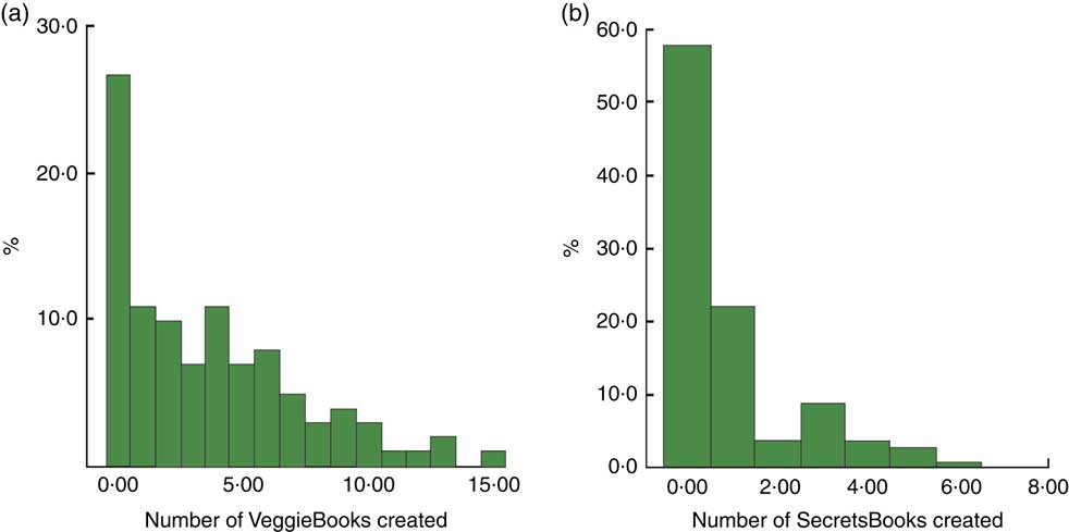 Fig. 5 (colour online) Children’s use of VeggieBook in the experimental pantries: (a) children’s number of VeggieBooks created, occasions captured electronically (n 109); and (b) children’s number of SecretsBooks created, occasions captured electronically (n 100). Children aged 9–14 years were from low-income households who were clients of fifteen community food pantry distributions in Los Angeles County, USA, and participated in the randomized controlled trial of the VeggieBook mobile phone app with their household cook (mother or grandmother), May 2015–June 2016