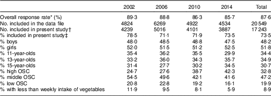 Table 1 Study population’s sex, age group, occupational social class (OSC) and less than weekly vegetable intake by survey year; nationally representative samples of 11–15-year-olds (n 17 243) from four waves of data collection in the Health Behaviour in School-aged Children (HBSC) study in Denmark, 2002–2014
