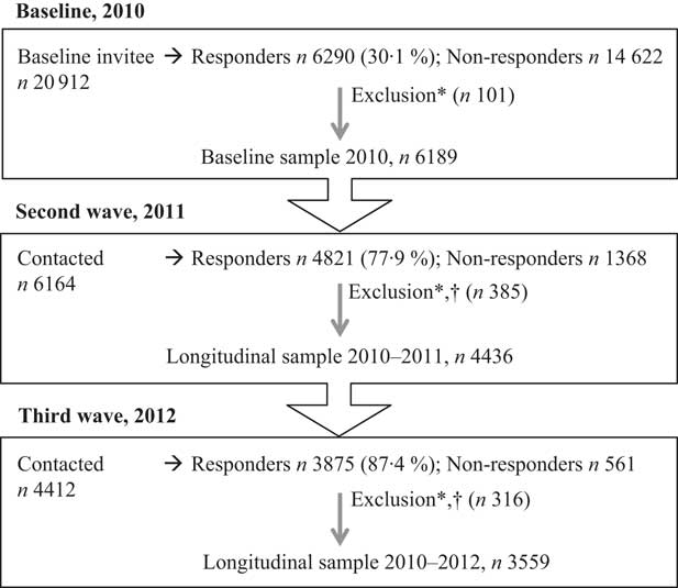 A mail survey was sent out to 20 912 randomly selected household addresses from the telephone book in the German-speaking and French-speaking parts of Switzerland. In 2010, 6290 of all those who were invited filled in the questionnaire (a response rate of 30 %). In 2011, all of the respondents from 2010 were contacted for the second survey, except for those persons who had to be excluded (see Fig. 1). For the third survey in 2012, only those who responded in 2011 and who did not have to be excluded in the data-file-matching procedure because of differences in their indicator variables (gender, birth date) were contacted (n 4412). Additionally, respondents who reported inconsistent body height at baseline and follow-up (>5 cm difference; n 164) were also excluded, because it was assumed that another person had filled in the questionnaire on their behalf. The longitudinal sample for 2010, 2011 and 2012 consisted of 3559 persons; 46 % of the participants were male. In 2012 the mean age was 56 (sd 14) years (range 22–94 years). Compared with the general Swiss population, the percentage of young adults (20–39 years old) was lower and more respondents had a higher secondary or college/university degree( 35 ). The whole sample's mean BMI was 25·7 (sd 0·1) kg/m2 for men and 23·4 (sd 0·1) kg/m2 for women.