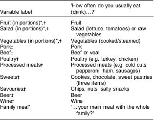 †Participants were additionally asked how many portions of vegetables and salad (one portion = a handful) as well as fruits (one piece or one handful) they usually ate when they consumed these foods. Consumption frequencies and portion numbers were multiplied. All other variables indicate consumption frequencies only.