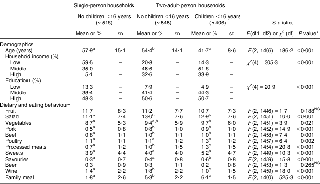 a,b,cOne-way ANOVA and χ 2 tests were used to examine differences between household types. Mean values within a row with unlike superscript letters were significantly different (post hoc test: Bonferroni, P<0·05).