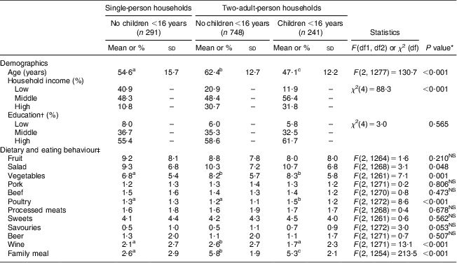 a,b,cOne-way ANOVA and χ 2 tests were used to examine differences between household types. Mean values within a row with unlike superscript letters were significantly different (post hoc test: Bonferroni, P < 0·05).