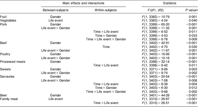Time × Life event × Gender interactions were found for the consumption of pork and savouries, indicating life-event-related changes in pork and savouries consumption that varied by gender. While men's pork consumption increased from meanT1 = 1·4 (se 0·2) times/week before the life event to meanT2 = 2·1 (se 0·2) times/week after the life event, the females’ consumption remained stable (meanT1 = 0·4 (se 0·2) times/week; meanT2 = 0·4 (se 0·2) times/week). The same pattern was found for the consumption of savouries. While men's savouries consumption increased from meanT1 = 0·5 (se 0·2) times/week to meanT2 = 1·1 (se 0·1) times/week, the females’ consumption remained stable (meanT1 = 0·2 (se 0·1) times/week; meanT2 = 0·2 (se 0·1) times/week). No significant life-event-related within-subjects effects were detected for fruit, vegetables, salad, beef, poultry, sweets, wine or beer. Therefore, those food groups did not change significantly over time in the life-event group.