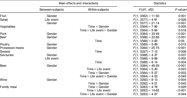 Table 4 Results for the life event of ‘moving in with a partner’ (n 72*). Significant main effects and interactions were found by conducting a mixed ANCOVA with two between-subjects factors (life event, gender), one within-subjects factor (time), and age and education as covariates. A mixed ANCOVA was conducted for every food-group variable and the family meal variable