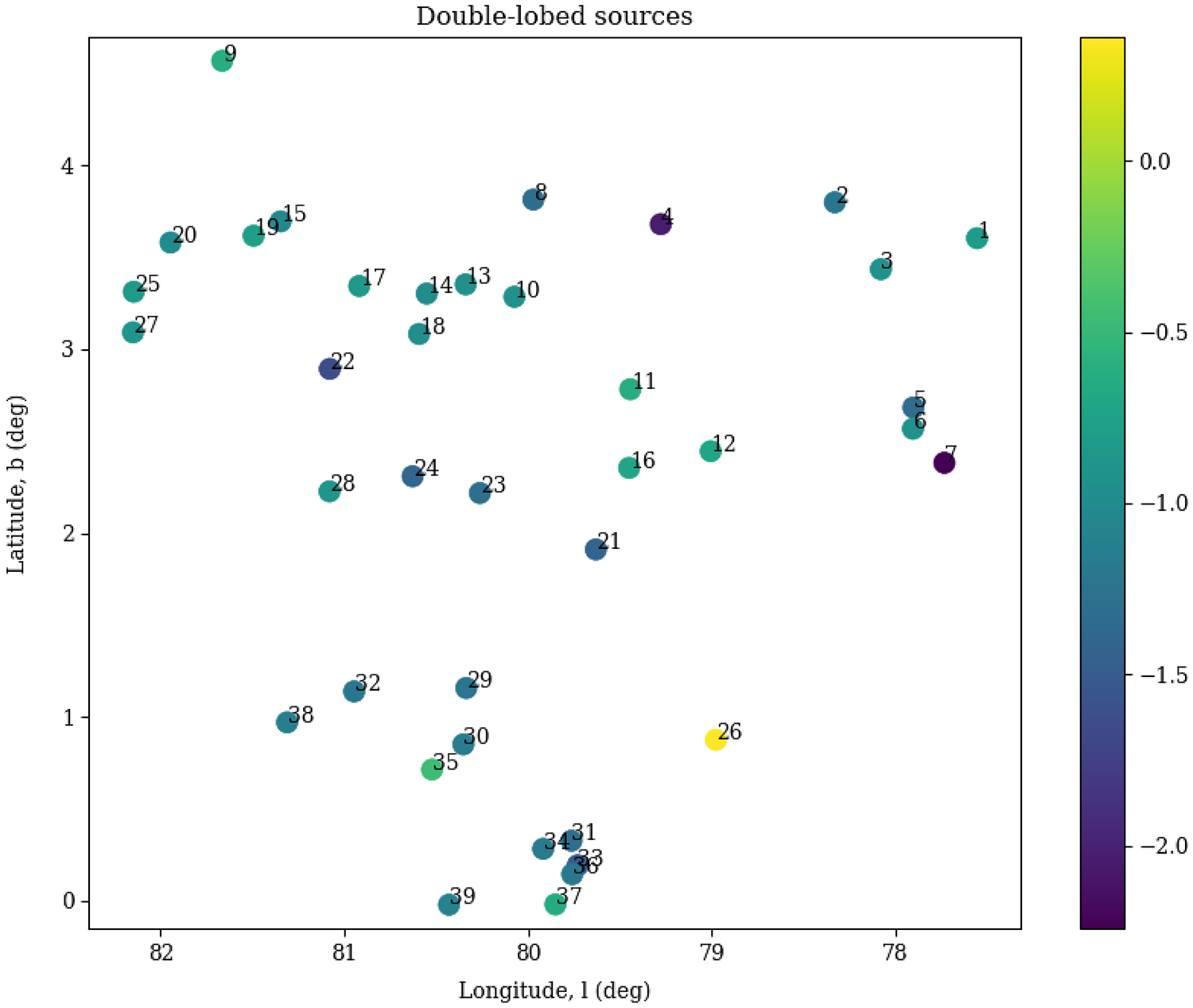 of the double-lobed source candidate; calculated using the flux sum of each source component.