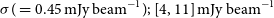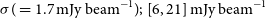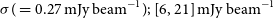 $\sigma (=0.27\,\mathrm{mJy\,beam}^{-1});\ [6, 21]\,\mathrm{mJy\,beam}^{-1}$
