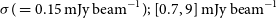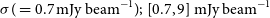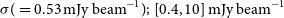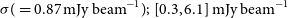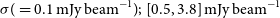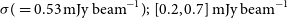 $\sigma(=0.53\,\mathrm{mJy\,beam}^{-1});\ [0.2, 0.7]\,\mathrm{mJy\,beam}^{-1}$