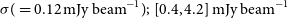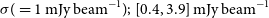 $\sigma(=0.36\,\mathrm{mJy\,beam}^{-1});\ [0.3, 3.9]\,\mathrm{mJy\,beam}^{-1}$
