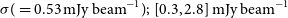 $\sigma(=0.53\,\mathrm{mJy\,beam}^{-1});\ [0.3, 2.8]\,\mathrm{mJy\,beam}^{-1}$