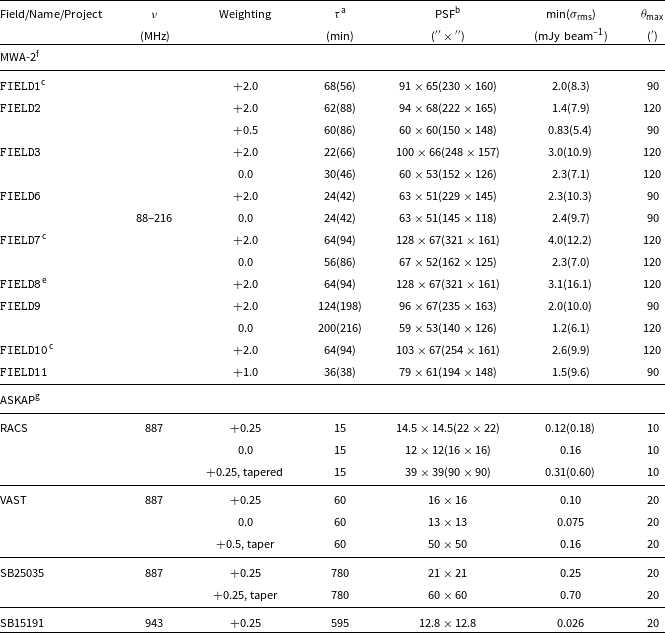 Table 2. MWA-2 and ASKAP observation and image details. Note due to the large number of separate images produced, there is a large range of values and here we report the minimum and maximum values for each quantity for each field. Exact PSF values used in measurements are provided as part of the online table described in Appendix B.