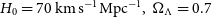 $H_0 = 70\,{\rm km}\,{\rm s}^{-1} {\rm Mpc}^{-1},\;\Omega_\Lambda = 0.7$