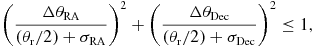 (6) $$\begin{equation} \left(\frac{\Delta \theta _{{\rm RA}}}{ (\theta _{\rm r} / 2) + \sigma _{{\rm RA}}}\right)^2 + \left(\frac{\Delta \theta _{{\rm Dec}}}{ (\theta _{\rm r} / 2) + \sigma _{{\rm Dec}}}\right)^2 \le 1, \end{equation}$$