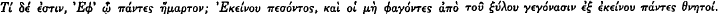 as meaning ‘because’. The relevant passage of the Latin translation of Origen's commentary (P.G. 14, col. 1011) is: ‘Absoluta sententia pronuntiavit Apostolus in omnes homines mortem pertransisse peccati, in eo in quo omnes peccaverunt, sicut et alibi. “Omnes enim”, inquit, “peccaverunt et egent gloria Dei.”’
